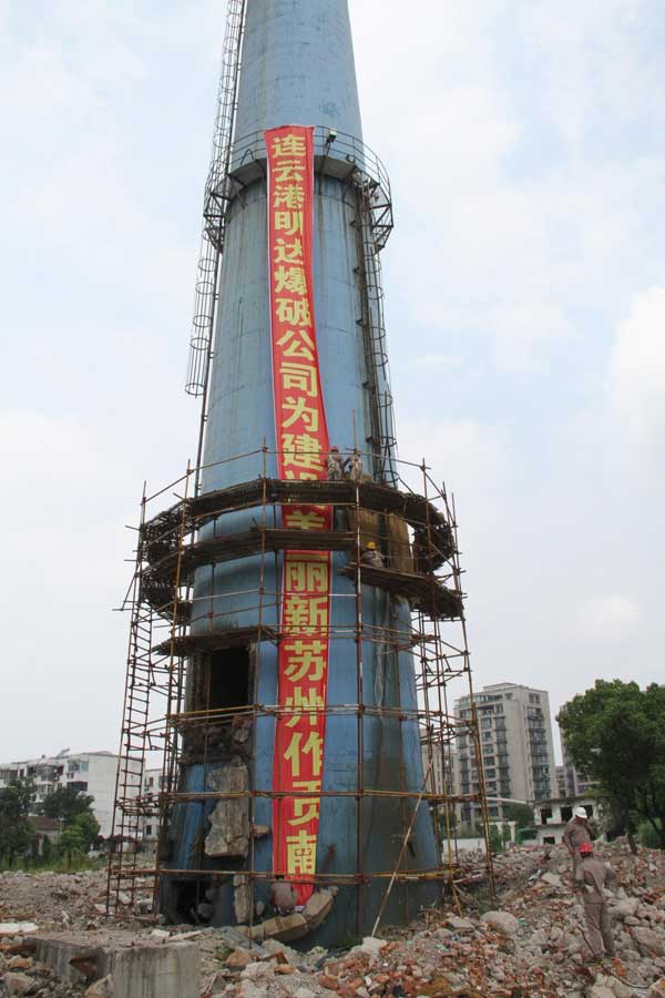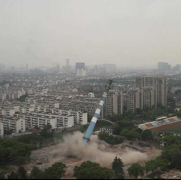 蘇州市地標(biāo)建筑之一,矗立在蘇州城南的蘇州熱電廠大煙囪,該煙囪高80m,周圍有小區(qū)、學(xué)校、高架橋、小商品市場,爆破環(huán)境復(fù)雜。我公司技術(shù)人員仔細(xì)勘察現(xiàn)場后,編制詳細(xì)的爆破方案。最終于2016年8月26日下午3點(diǎn)整實(shí)施爆破拆除,伴隨蘇州人33年的電熱廠大煙囪從此成為歷史。